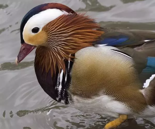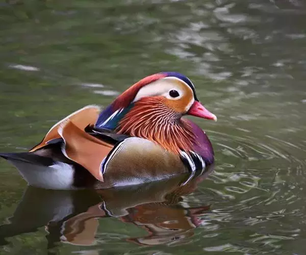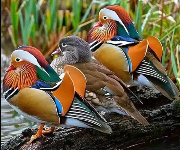 林鸳鸯体长47-54厘米,翼展66-75厘米,雄性体重544 - 862克,雌性体重499 - 862克,雌、雄羽色差异大,雄鸭鲜艳(尤其在繁殖季节)、雌鸭朴素。雄雌均具独特羽冠(夏羽无羽冠)。雄鸟羽冠有两条纵列的白色条纹,头紫色和绿色相间,胸红褐色有白斑,两肋青铜色。雌鸟羽毛上有白色眼环,体羽为煤灰色,喉白色,胸部有白色条纹。幼鸟的羽毛颜色上黑下白,与一般的鸭子的黄色幼鸟截然不同。