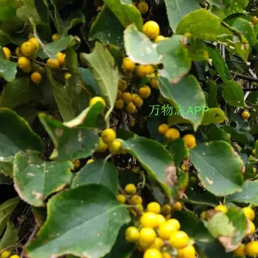 南蛇藤(学名:Celastrus orbiculatus Thunb.):卫矛科南蛇藤属落叶藤状灌木。小枝光滑无毛,灰棕色或棕褐色,腋芽小,卵状到卵圆状,叶通常阔倒卵形,近圆形或长方椭圆形,边缘具锯齿,两面光滑无毛或叶背脉上具稀疏短柔毛,聚伞花序腋生,花小,雄花萼片钝三角形;花瓣倒卵椭圆形或长方形,花盘浅杯状,雌花花冠较雄花窄小,肉质,子房近球状,蒴果近球状,种子椭圆状稍扁,赤褐色。5-6月开花,7-10月结果。