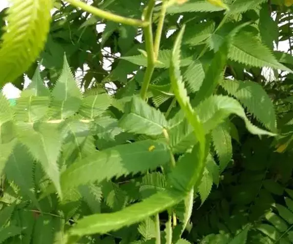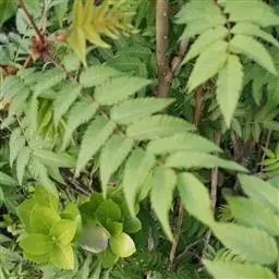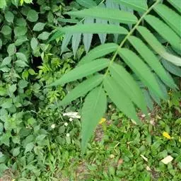 羽状复叶,小叶片11-17枚,连叶柄长13-23厘米,宽10-13厘米,叶轴微被短柔毛;小叶片对生,相距2-2.5厘米,披针形至卵状披针形,长5-7厘米,宽1.8-2.5厘米,先端渐尖,稀尾尖,基部近圆形或宽楔形,稀偏斜,边缘有尖锐重锯齿,上下两面无毛或近于无毛,羽状网脉,具侧脉12-16对,下面明显;小叶无柄或近于无柄;托叶叶质,卵状披针形至三角披针形,先端渐尖至急尖,边缘有不规则锯齿或全缘,长8-13毫米,宽5-8毫米,外面微被短柔毛。