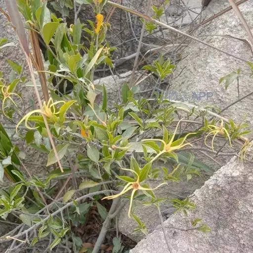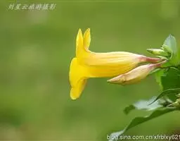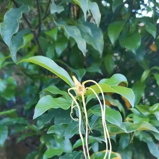 聚伞花序顶生,通常着花3朵,无毛;总花梗长0.51.5厘米;花梗长0.5-1厘米;苞片和小苞片线状披针形,长5-10毫米;花黄色;花萼筒长5毫米,萼片披针形,长8-9毫米,基部宽2毫米,顶端长渐尖,绿色或黄绿色,内面基部有腺体;花冠漏斗状,花冠筒淡黄色,长1.2-1.5厘米,下部圆筒状,上部渐扩大呈钟状,内面被疏短柔毛,花冠裂片黄色外弯,基部卵状披针形,顶端延长成一长尾带状,长达10厘米,基部宽0.4-0.5厘米,裂片内面具由10枚舌状鳞片组成的副花冠,高出花冠喉部,白黄色,鳞片每2枚基部合生,生于花冠裂片之间,顶部截形或微凹,长3毫米,宽1毫米;雄蕊内藏,着生在冠檐基部,花丝延长至花冠筒上呈肋状凸起,被短柔毛,花药箭头形,基部具耳,药隔顶部渐尖成一尾状体,不伸出花冠喉部,各药相连,腹部粘于柱头上;子房半下位,由2枚离生心皮组成,无毛,花柱圆柱状,柱头棍棒状,顶端浅裂,每心皮有胚珠多颗;无花盘。