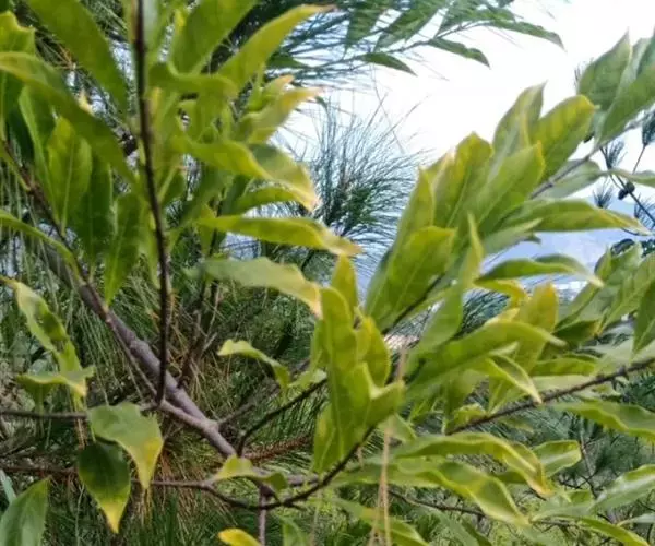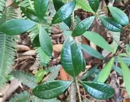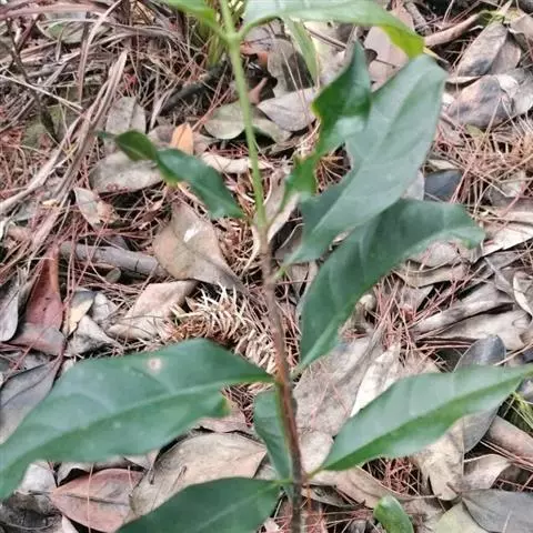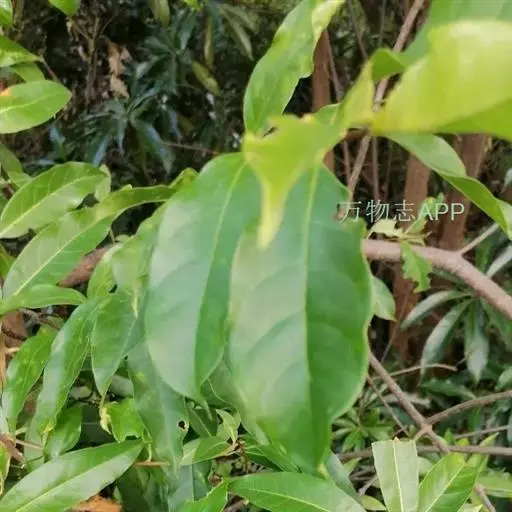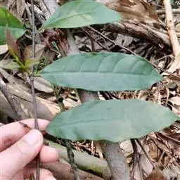 叶薄纸质,椭圆状长圆形或椭圆形,长3-10厘米,宽1.5-5厘米,顶端短渐尖或急尖,基部楔形,边缘全缘或有时略带微波状,叶面深绿色,叶背浅绿色,两面无毛;中脉在叶面扁平或凹陷,在叶背略凸起,侧脉通常每边6条,斜曲上升,叶缘前网结;叶柄短,长5毫米。