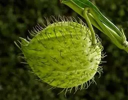 干燥种子呈纺锤形而扁,长约2厘米,宽约5毫米,基部钝,先端尖,顶部留有着白色丝状细长毛的痕迹,脐点在种毛附近的稍下方,种脊位于一侧,白色线状,微凸起,表面棕褐色,有纵纹,并微有扭曲。易折断,断面灰白色,角质,以手指挤压,有油脂溢出。