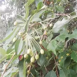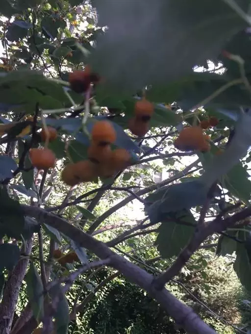 果实近球形,直径1.5-2厘米,黄色,萼片宿存,基部不下陷,梗洼隆起;果梗细长,先端肥厚,长3-4厘米。花期4-5月,果期8-9月。