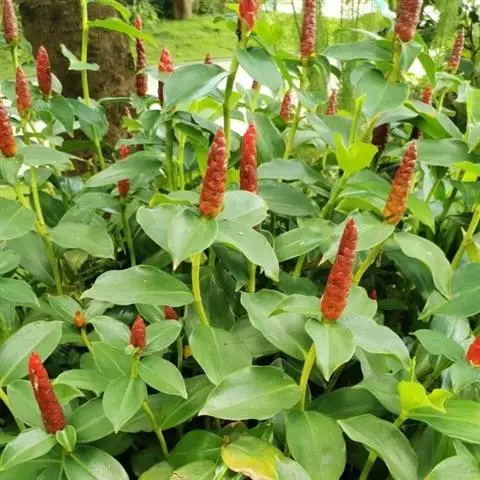 密苞山姜是姜科,山姜属多年生草本植物,株高可达1.5米。叶片椭圆状披针形,顶端渐尖,并具细尾尖,基…