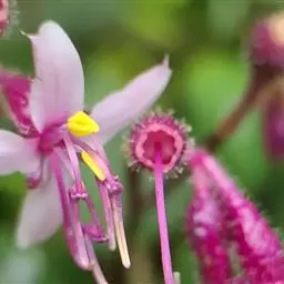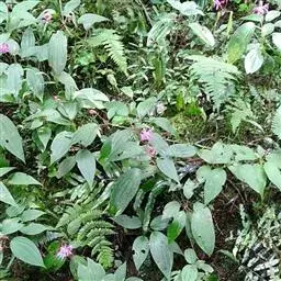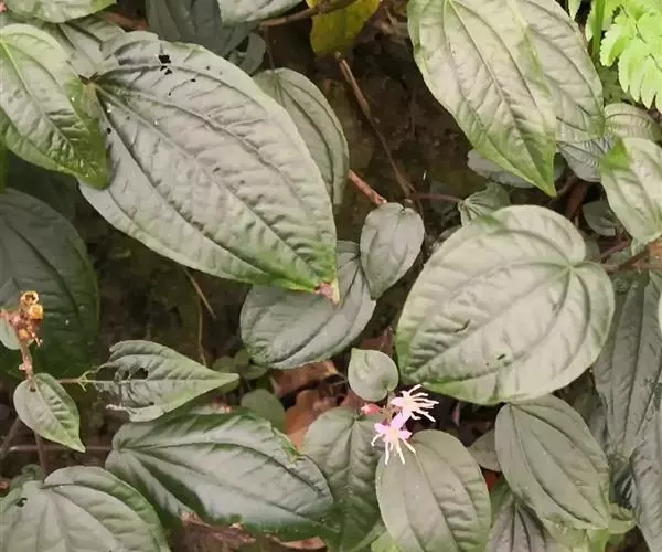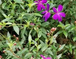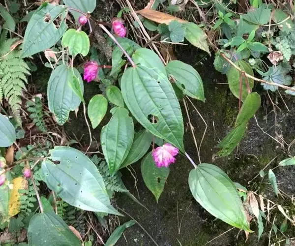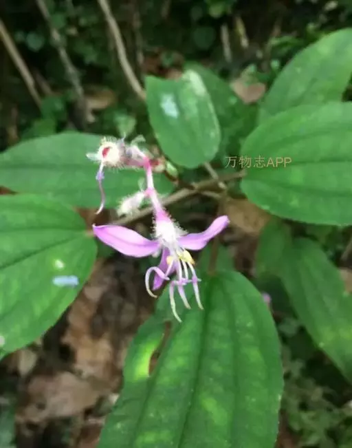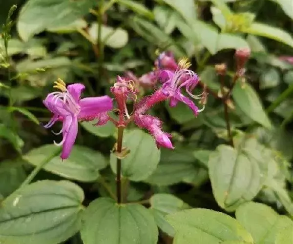 异药花(Fordiophyton faberi Stapf)别称:酸猴儿、臭骨草、伏毛肥肉草、峨眉异药花,野牡丹科野海棠属草本或亚灌木,高30-80厘米;茎四棱形,有槽,无毛,不分枝。叶片膜质,通常在一个节上的叶,大小差别较大,广披针形至卵形,稀披针形,顶端渐尖,基部浅心形,稀近楔形,侧脉不明显,背面几无毛或被极不明显的微柔毛及白色小腺点,基出,脉明显,隆起,侧脉及细脉不明显;宿存萼与蒴果同形,具不明显的8条纵肋,无毛,膜质冠伸出萼外,4裂。花期8-9月,果期约6月。