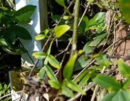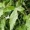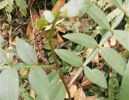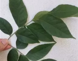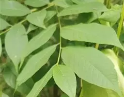 叶对生,叶轴长9-17厘米,淡灰褐色,无毛,小叶3,稀为5,纸质,长圆状椭圆形或长卵形,长(6~)8~10厘米,宽(2.5~) 3.5~4.5厘米,先端长渐尖,基部宽楔形,边缘微反折,具锯齿,上面深绿色,无毛,背面色淡,向基部脉腋(中脉两侧)疏生白色微柔毛,余无毛,主脉在两面明显,侧脉6~7,与网脉在两面明显,侧、叶柄长经尧望篡半,中、叶柄长(1~)2.5~3.5厘米。