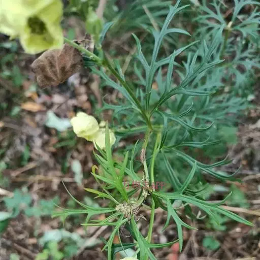 茎下部叶在开花时枯萎,中部叶具稍长柄;叶片宽菱状卵形,长4.2-6.4厘米,宽3.6-6.4厘米,三全裂,全裂片细裂,小裂片线形或线状披针形,干时边缘稍反卷,两面几无毛;叶柄长为叶片的1/4或比叶片稍短,长1.4-4.5厘米,无毛,具狭鞘。