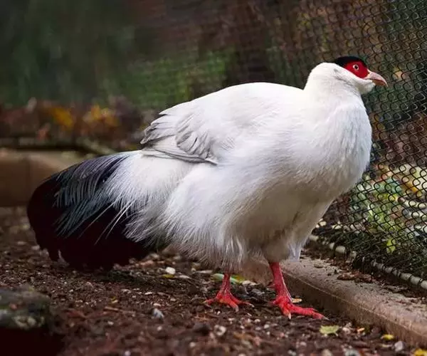 白马鸡雄鸟头顶密被以黑色绒羽状短羽;耳羽簇白色,向后延伸成短角状,但不突出于头上。上下体羽几纯白色,羽端分散呈发丝状。背微沾灰色;颏、喉沾棕,较长的尾上覆羽和翅上覆羽稍沾暗灰色,初级覆羽内翈暗褐色;外翈暗灰褐色而具白色羽缘,次级飞羽黑褐色而具紫色光彩;初级飞羽和小翼羽暗褐褐色;尾特长,辉绿蓝色,基部灰色,末端具带金属光泽的暗绿和蓝紫色;中央一、二对尾羽大部羽枝分散下垂。 雌鸟和雄鸟相似,但体型稍小,羽色较暗淡。 虹膜橙黄色,脸部裸出,呈鲜红色,具疣状小突;嘴粉红色;脚,趾红色,爪角色。雄鸟具距。