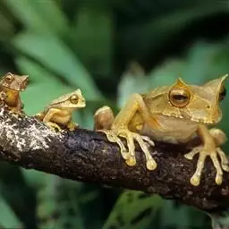 树蛙是树蛙科两栖动物的统称。树蛙体中等或大,一般雄蛙吻端斜尖,雌蛙吻端高钝;舌后端缺刻深,梨骨齿发达,…