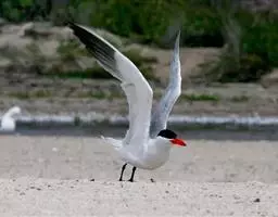 细嘴鸥(学名:Larus genei):是鸟纲、鹬科的中等水鸟,体重320-350克;体长420-470毫米。额平扁而长。嘴较细长。头、颈、腰、尾和下体白色,冬季耳区有不清晰的暗色斑。胸、腹常缀有粉红色。背、肩和翅覆羽淡灰色,外侧初级飞羽白色具黑色端斑,次级飞羽淡灰色具白色羽端。脚红色。飞翔时通体多呈白色,仅翼尖黑色。虹膜黄色;嘴细长、深血红色,尖端黑色;眼周亮红色,脚和趾红色。