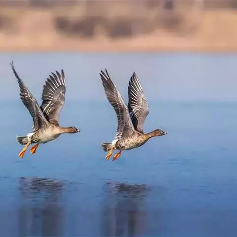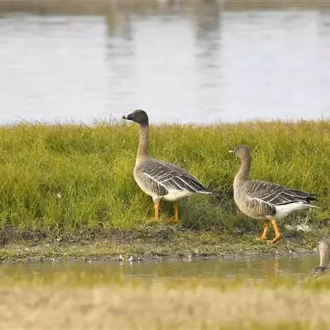 豆雁,雁形目鸭科。成鸟头、颈、背灰褐色,带淡黄色羽缘;尾上覆羽白色,尾羽黑褐色带白端,…