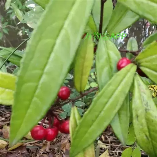 山血丹 灌木或小灌木,高1-2米;茎幼时被细微柔毛,无皱纹,除侧生特殊花枝外,无分枝。叶片革质或近坚纸质,长圆形至椭圆状披针形,顶端急尖或渐尖,稀钝,基部楔形,长10-15厘米,宽2-3.5厘米,近全缘或具微波状 齿,齿尖具边缘腺点,边缘反卷,叶面无毛,中、侧脉微隆起,背面被细微柔毛,脉隆起,除边缘外其余无腺点或腺点极疏,侧脉8-12对,连成远离边缘的边缘腺;叶柄长1-1.5厘米,被微柔毛。