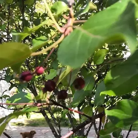 果实卵形,直径2-2.5厘米,红色,先端渐尖,稍具隆起,萼洼微突,萼片宿存肥厚,果梗细长。花期4-5月,果期8-9月。