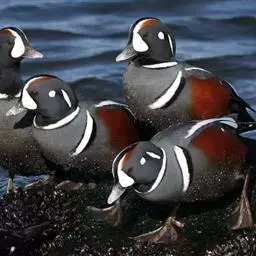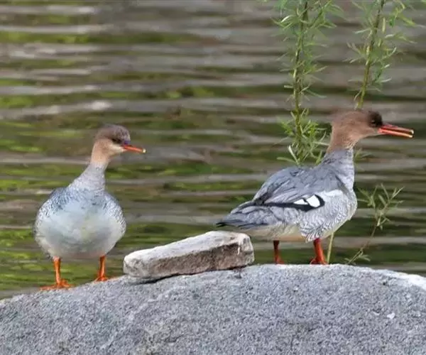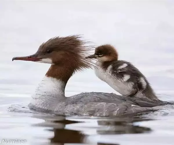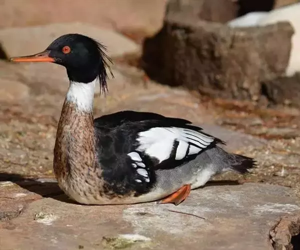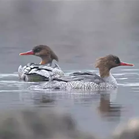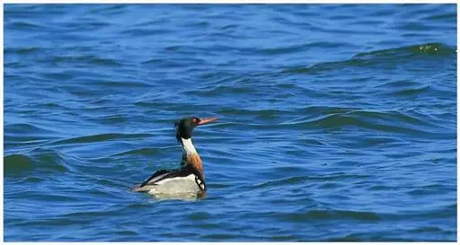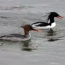 红胸秋沙鸭(学名:Mergus serrator)属中等食鱼鸭类,体长53厘米。嘴细长而带钩,捕食鱼类。丝质冠羽长而尖。雄鸟黑白色,两侧多具蠕虫状细纹。雌鸟及非繁殖期雄鸟色暗而褐,近红色的头部渐变成颈部的灰白色。生活于河流,湖泊,海洋,苔原。常成家族群或小群迁飞,偶尔也见有单只的。食物主要为小型鱼类,也吃水生昆虫、昆虫幼虫、甲壳类、软体动物等其他水生动物。偶尔也吃少量植物性食物。分布于全北界、印度、中国,越冬于东南亚。