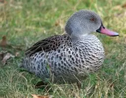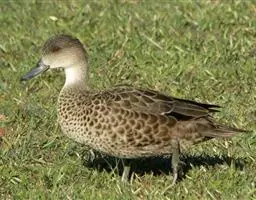 蓝翅鸭(图2) 蓝翅鸭身长37- 41 cm,翼展60 - 64 cm,雄鸭体重273 -410 、雌鸭体重266 - 375 g。是小型的长嘴涉禽。头部是灰色,白眼圈,白眼纹和眼先。体羽红褐色,羽毛有白色镶边。尾覆羽有黑白两色相杂,侧翼有深蓝色翼镜标记。雌鸭和幼鸭体羽是斑驳的褐色,脚黄色,鸭嘴黑色。在繁殖期雄鸭的体羽中有小暗斑。