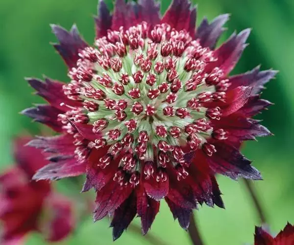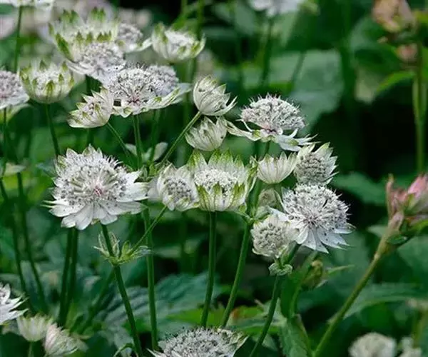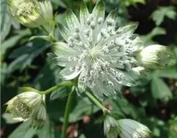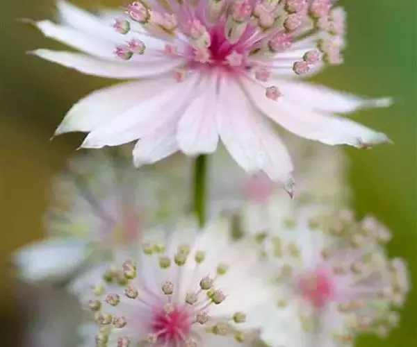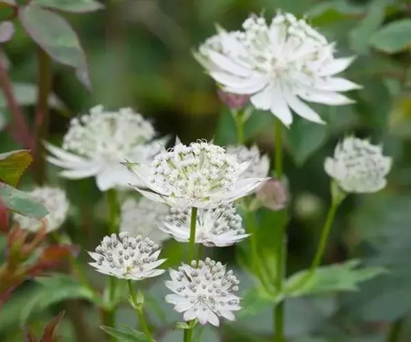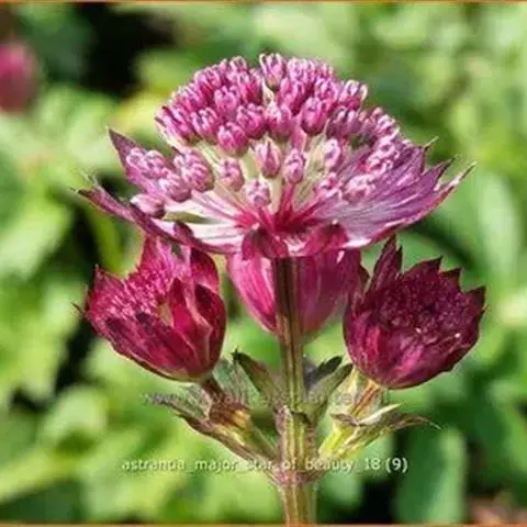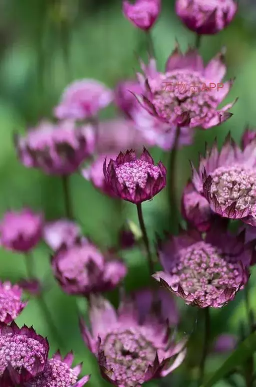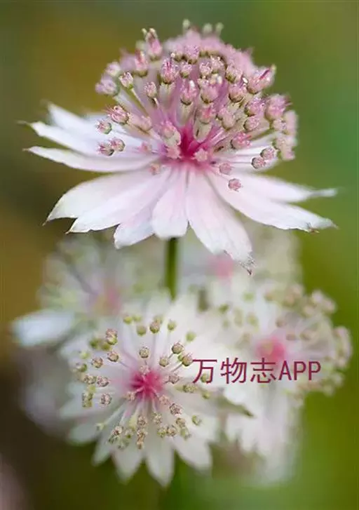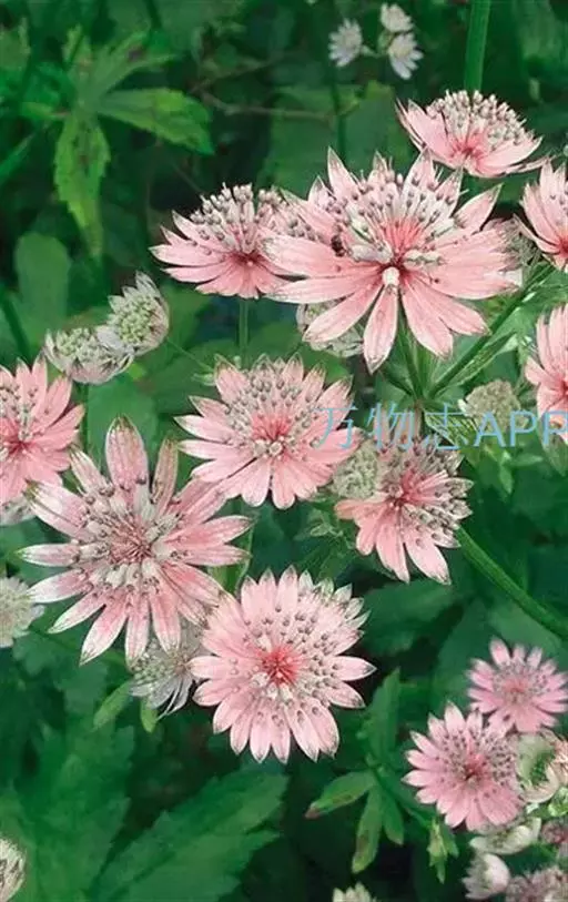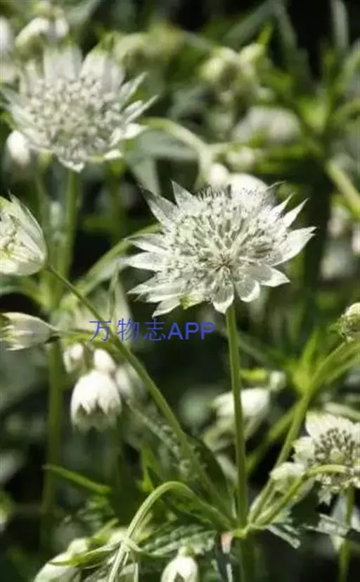 大星芹,Astrantia major,伞形科星芹属的一种多年生草本,株高60-90cm,多分枝丛状,叶大部基生,有长柄,叶片5掌状深齿裂;茎生叶少,3-5深裂,叶柄宽大而抱茎。复伞形花序。