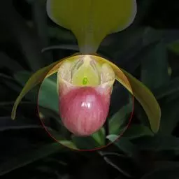 花瓣宽卵形,长1.5-2.2厘米,宽1.4-1.7厘米,先端钝,具10条脉;唇瓣肉质,贴生于蕊柱基部,长约为萼片的一半,3裂;侧裂片小,白色,近圆形;中裂片较大,楔状扇形,长约1.2厘米,宽1厘米,先端钝,基部(位于距口处)具1个直立的附属物,上面紫丁香色,具1条纵向脊突;距囊状,长约3毫米;蕊柱长约1厘米,粗4毫米,具翅;蕊柱齿三角形;蕊喙2裂;裂片舌状,长约2.5毫米;药帽前端收狭呈喙状。花期6-7月。