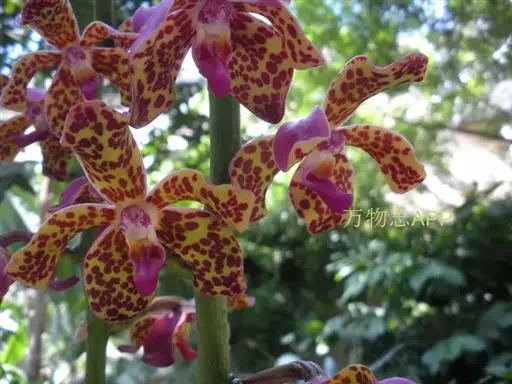 花序1-6个,长达35厘米;花序柄粗壮,长5-17厘米,粗4-6毫米,被3-4枚鞘;花序轴长约为花序长的1/3-1/2,疏生5-8朵花;花苞片大,宽卵形,长1.2-1.5厘米,宽7-10毫米,先端钝;花梗和子房长3-4厘米;花大,稍肉质,萼片和花瓣黄色带暗紫色斑点;萼片近相似,近宽倒卵形,长2-2.6厘米,宽1.2-1.5厘米,先端钝,具10条脉,在背面中肋隆起呈龙骨状。