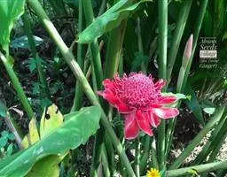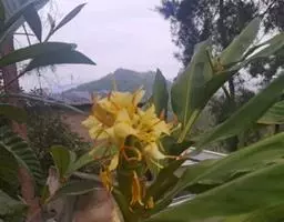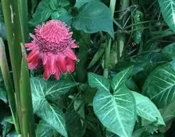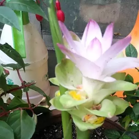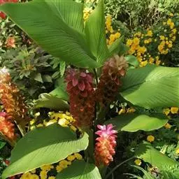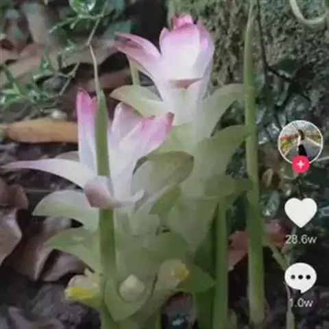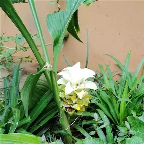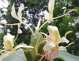 穗状花序从根茎抽出,和具叶的营养茎分开;总花梗长7-14厘米,花序长约15厘米,直径约7厚米;花序下部的苞片阔卵形,长约4厘米,先端平展,淡绿色,上部的苞片长圆形,斜举,淡红色;花生于下部和中部的苞片腋内;花萼白色,长约1厘米,一侧裂至中部,先端有3钝齿;花冠管长2厘米,喇叭状,喉部密生柔毛,花冠裂片3片,卵形,长约1厘米,后方的1枚较宽,宽约9毫米,先端尖,略成兜状,两侧的稍狭;侧生退化雄蕊长圆形,与花冠裂片近等长;唇瓣近圆形,淡黄色,先端3浅圆裂,中部裂片稍长,先端2浅裂;花丝扁阔,花药狭长圆形,长约4毫米,药室紧贴,基部有距;花柱丝状,无毛,柱头头状,具缘毛;子房被长柔毛。花期5-7月。