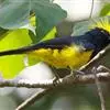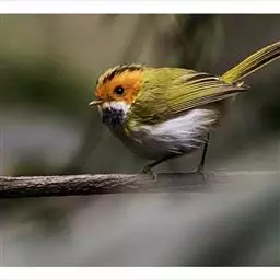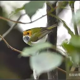 棕脸鹟莺:体长10厘米,是一种色彩亮丽而有特色的莺鸟。头栗色,具黑色侧冠纹。上体绿,腰黄色。下体白,…