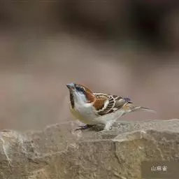 山麻雀:小型鸟类,体长13-15厘米。雄鸟上体栗红色,背中央具黑色纵纹,头棕色或淡灰白色,颏、喉黑色,…