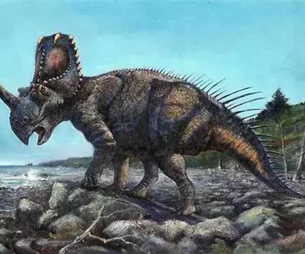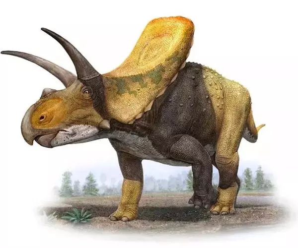 牛角龙是生活在白垩纪晚期的草食性恐龙,距今约7000万年前的北美洲,体长约8米。它有一个巨大的脑袋,脑袋后部还有一个色彩艳丽的超大头盾,眼睛上面有两只大尖角,鼻子旁还有一个小角。是用四条腿行走的草食性恐龙。