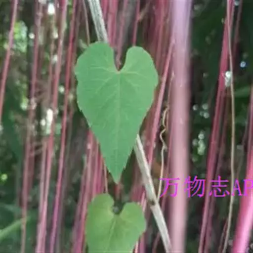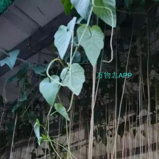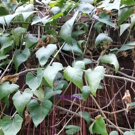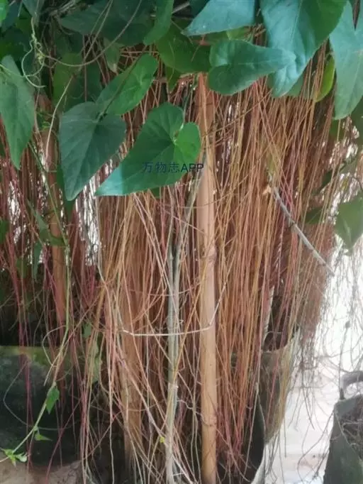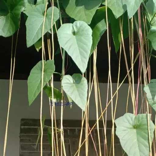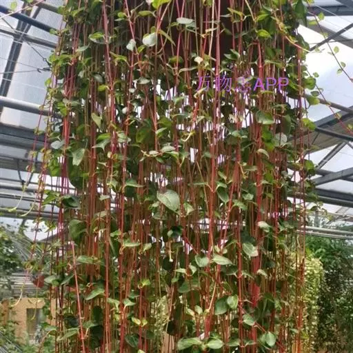 锦屏藤 多年生常绿草质藤蔓植物,具卷须,与叶对生;攀援茎,茎蔓草质柔韧,呈扁形或圆柱形,老茎蔓呈灰白色,表皮粗糙,嫩茎青绿色,表皮光滑油亮,主蔓粗度达2~3厘米,蔓长10~15米;气生根线形,着生于茎节处,每节可长出5~7条气生根,短截的气生根可分生多条侧根,下垂生长。初生气根紫红色,质地光滑脆嫩,老熟气根黄绿色,质地粗糙柔韧,长度可达3~4米或更长。