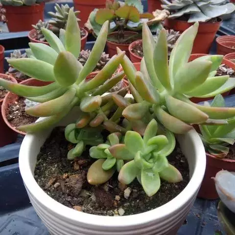 白厚叶弁庆的自然变种 白厚叶弁庆还有一个自然变种叫Sedum allantoides var.goldii,中文名不详。叶片形状为倒卵形,其他特征均与白厚叶弁庆相像。