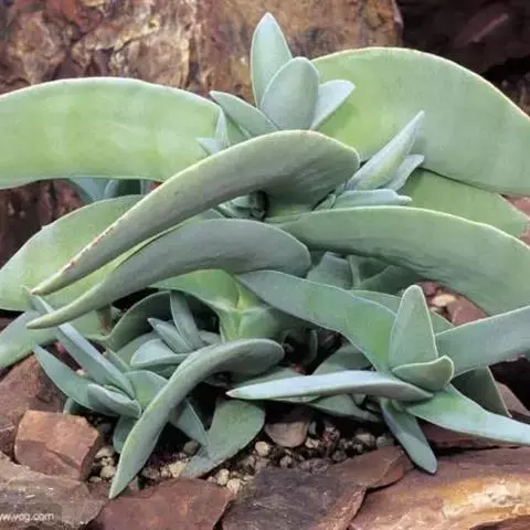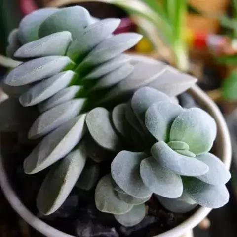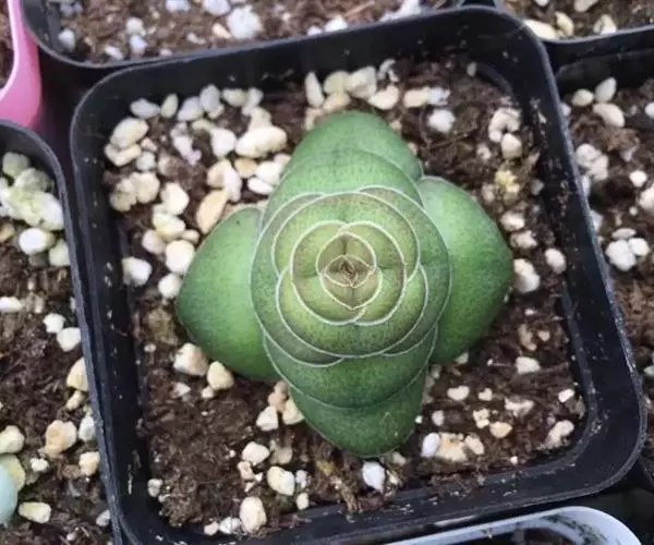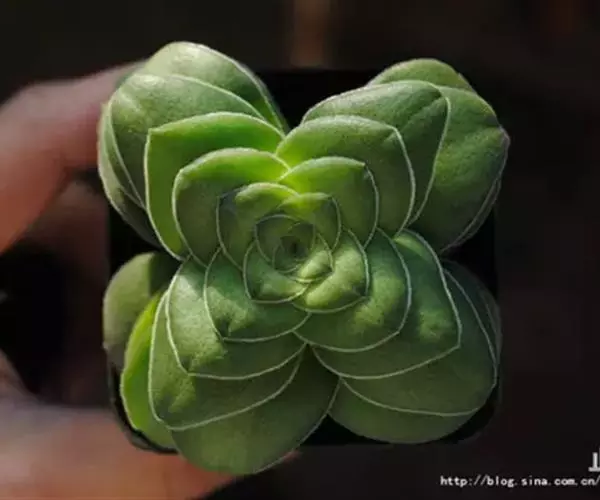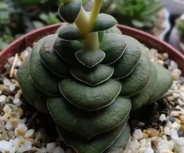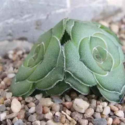 巴的植株具短茎,肉质叶半圆形,交互对生,上下叠接呈十字形排列,叶面绿色,有光泽,叶面密生细小疣突而略显粗糙,顶端有椭圆形尖头,整个叶缘有白色毫毛,看起来就象镶上的白边,植株基部易生侧芽。