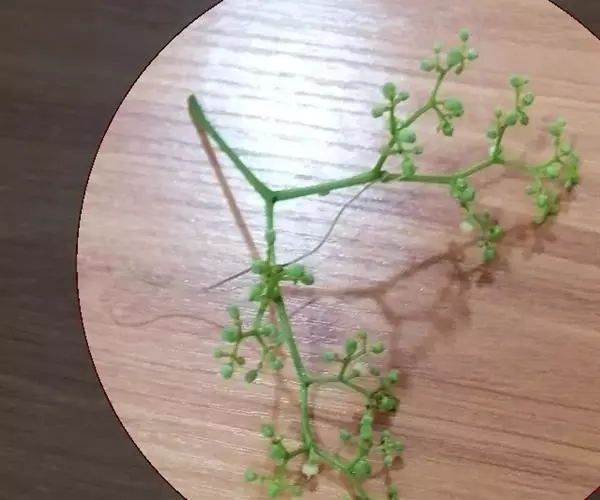 复伞形花序顶生,花序梗长2-16厘米;无总苞;伞辐6-16,不等长,长1-3厘米,直立和展开;小总苞片2-8,线形,长约2-4毫米;小伞形花序有花20余朵,花柄长2-4毫米;萼齿线状披针形,长与花柱基相等;花瓣白色,倒卵形,长1毫米,宽0.7毫米,有一长而内折的小舌片;花柱基圆锥形,花柱直立或两侧分开,长2毫米。