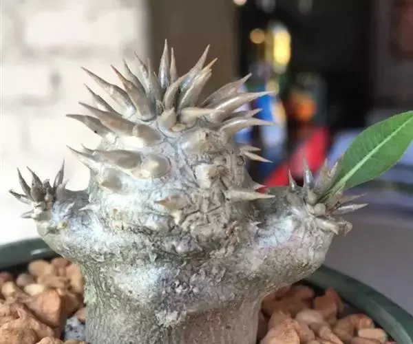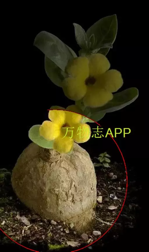惠比须笑是夹竹桃科棒捶树属多年生肉质植物。根茎不规则膨大,肉质,内含大量水分,外皮褐色至灰色,具不规则突起和皮刺。叶长椭圆形,长3cm— 5cm,宽约1cm。深绿色,叶柄直接着生于根茎突起部位。花梗长2cm—2.5cm,淡绿色。花黄色,花冠5裂。