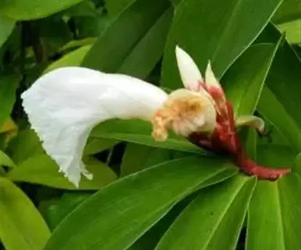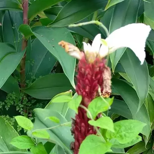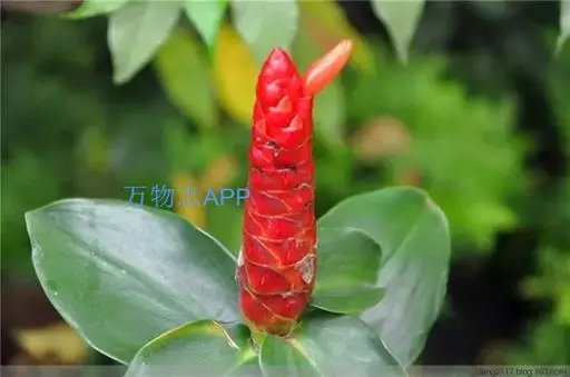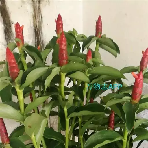 株高1-3米,基部近木质,顶部常分枝,旋卷。叶片长圆形或披针形,长15-20厘米,宽6-10厘米,顶端渐尖或尾状渐尖,基部近圆形,叶背密被绢毛。穗状花序顶生,椭圆形或卵形,长5-15厘米;苞片卵形,革质,红色,长2厘米,被短柔毛,具增厚及稍锐利的短尖头;小苞片长1.2-1.5厘米,淡红色;花萼革质,红色,长1.8-2厘米,3裂,嫩时被绒毛;花冠管短,长1厘米,裂片长圆状椭圆形,长约5厘米,白色或顶部红色;唇瓣宽喇叭形,纯白色,长6.5-9厘米,顶端具裂齿及皱波状;雄蕊花瓣状,长约4.5厘米,宽1.3厘米,上面被短柔毛,白色,基部橙黄。蒴果稍木质,长1.3厘米,红色;种子黑色,光亮,长3毫米。花期:7-9月;果期:9-11月。