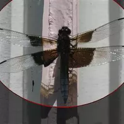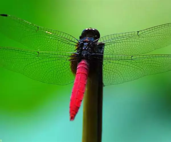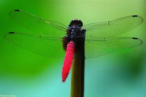 形态特征:中型种类,腹长约30mm,较粗壮;红褐色,翅基部具有小型褐色斑;胸部色暗;额色黑;为其较为突出的特征。常见于林地、池沼等环境中。