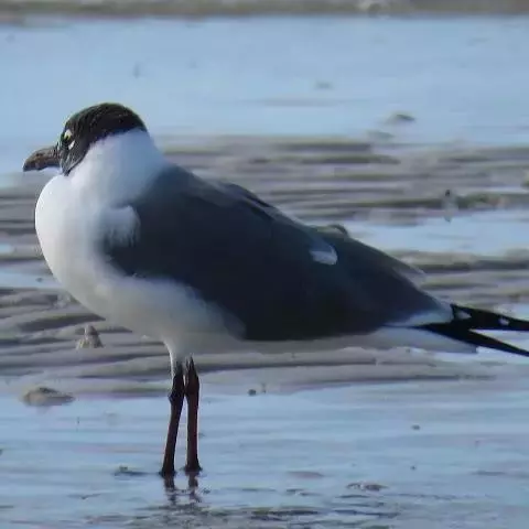 鸥嘴噪鸥,中型水禽,体长31~39厘米。夏羽额、头顶、枕和头的两侧从眼和耳羽以上黑色。背、肩、腰和…