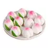 民间年画上的老寿星,手里总是拿着桃--“寿桃”,过生日做寿时要蒸桃形的馒头,或实心、或空心里面填馅,做成圆馒头状,在顶都捏出桃尖,用竹刀或刀背从上至下轧出一个桃形槽来,将桃尖略微弯曲,再染成红色,上笼蒸熟,“寿桃”就做成了。在老人生日那天,献给老人,以祝福老人健康长寿。