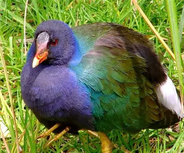 这种紫水鸡非常美丽,体羽有亮丽的光泽。额顶有一块亮青色的额甲,在这之下是鲜艳的红鼻瘤。嘴粗壮,短而侧扁;鼻沟浅而宽,鼻孔小而圆,在鼻沟前部下方,额甲宽大,后缘呈截形。翅圆形,第2枚、第3枚和第4枚初级飞羽最长,并几乎等长;第1枚和第6枚或第7枚初级飞羽等长。跗蹠和趾都长而有力;能用脚趾抓住和操纵食物,两性同型,体羽为紫色或蓝色,尾下覆羽略淡。