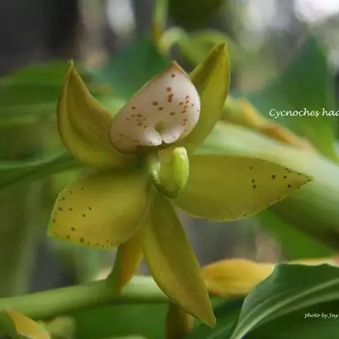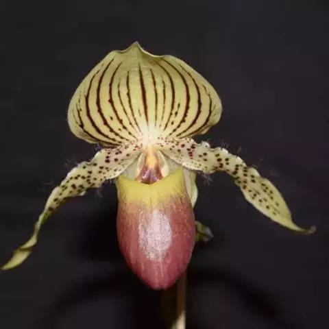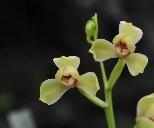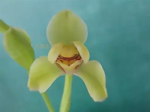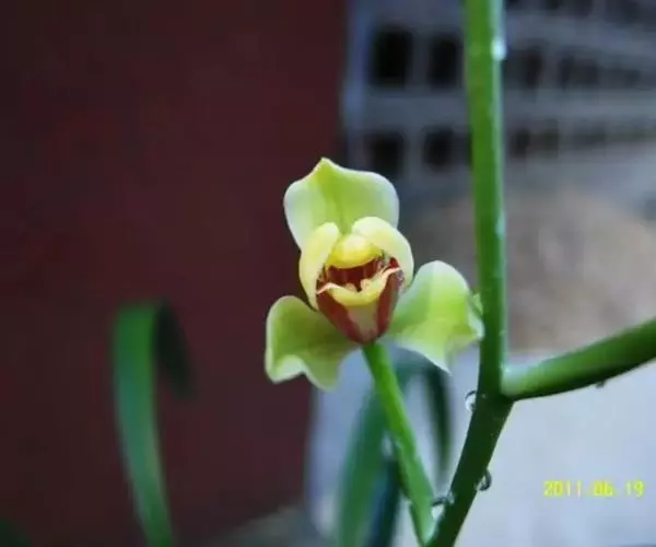 花莛挺立,高15-24cm,黄绿色;一莛着花3-6朵,排列松散;花序基部鞘底色黄绿,微被紫红色筋纹;花苞片长阔,颜色与花莛相近;萼片(外三瓣)长圆形,基部狭,向 夏皇梅 前渐阔,2/3处最阔,前端收狭且紧边,尖端成对折状,中线部分外凸,萼片长1.6-2.0cm,宽0.7-0.9cm,色黄绿,偏黄;花瓣(捧心、捧瓣)较萼片短小,与唇瓣(舌)同时分立于蕊柱(鼻头)三侧,并紧靠蕊柱,花瓣基部狭长,从中部起紧边,前端圆钝,起深兜,两花瓣前端分离大,蕊柱顶明显外露,花瓣浅黄色,其中下部、蕊柱腹部具均匀的紫红斑纹;唇瓣短圆,中裂片前端微下挂,明显增厚,边缘微内卷呈浅兜,侧裂片不明显,唇瓣底色浅黄,两侧密被紫红色纹,并且透于外部;花直径1.8-2.2cm。