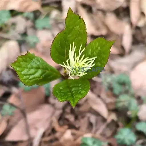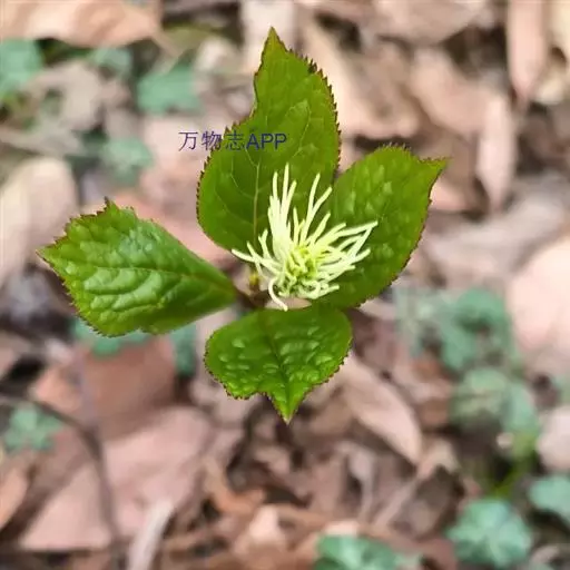 多年生草本,高15-40厘米,全部无毛;根状茎粗短,密生多数细长须根;茎直立,单生或数个丛生,下部节上对生2片鳞状叶。叶对生,通常4片生于茎上部,纸质,宽椭圆形、长椭圆形或倒卵形,长5-11厘米,宽3-7厘米,顶端短尖,基部宽楔形,边缘有圆锯齿或粗锯齿,齿尖有一腺体,近基部全缘,嫩叶背面密生细小腺点,但老叶不明显;侧脉4-6对,网脉明显;叶柄长1-1.5厘米;鳞状叶三角形;托叶条裂成钻形。穗状花序单一,由茎顶抽出,连总花梗长4-6厘米;苞片倒卵形,通常2-3齿裂;花白色,有香气;雄蕊3枚,药隔基部合生,着生于子房上部外侧,中央药隔具1个2室的花药,两侧药隔各具1个1室的花药,药隔伸长成丝状,直立或斜上,长1-1.9厘米,药室在药隔的基部;子房倒卵形,无花柱。核果球形,淡黄绿色,有纵条纹,长约3毫米,近无柄。花期4-5月,果期5-6月。
