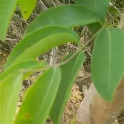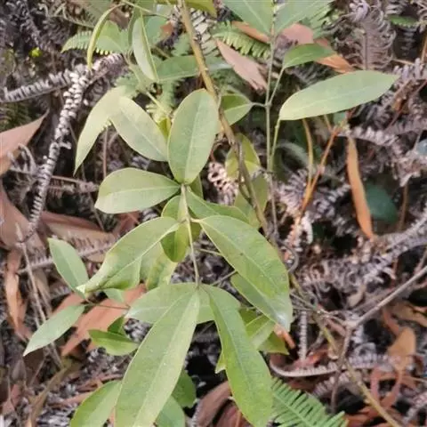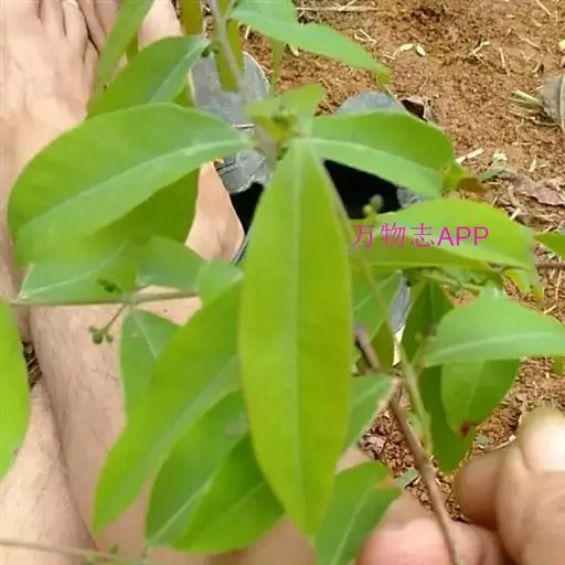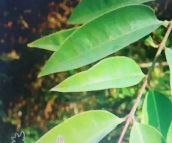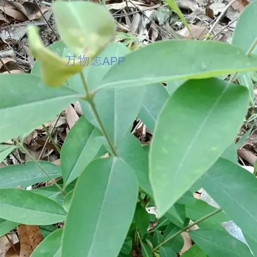 叶片椭圆形至长椭圆形或披针形,长3-10.5cm,宽1-4cm,先端骤然锐尖或渐尖,基部钝形至楔形,坚纸质,两面无毛,上面绿色,下面粉绿色,有透明腺点及黑点,中脉在上面凹陷,下面凸起,侧脉每边8-12条,两面凸起,斜展,末端不呈弧形闭合,小脉网状,两面凸起;叶柄长2-3mm,无毛。