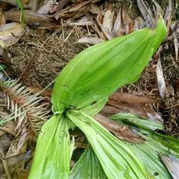 无茎盆距兰茎粗短,长1-2厘米,具3-5枚叶。叶二列,稍肉质或革质,长圆形至长圆状披针形,长8-20厘米,宽1.7-6厘米,先端钝并且不等侧2裂。
