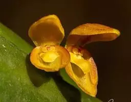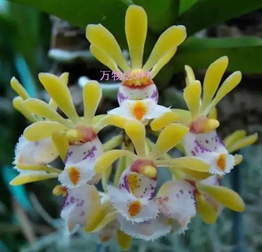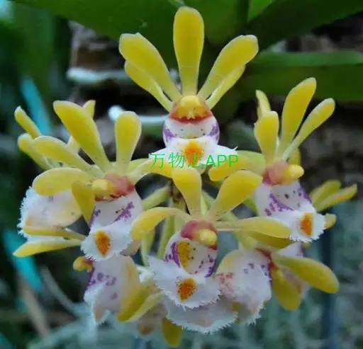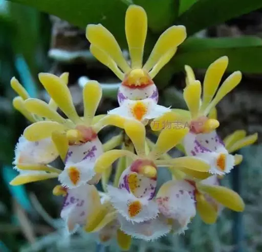 无茎盆距兰(学名:Gastrochilus obliquus (Lindl. ) Kuntze):茎粗短,长1-2厘米,具3-5枚叶。叶二列,稍肉质或革质,长圆形至长圆状披针形,先端钝并且不等侧2裂。花序近伞形,1-4个,出自茎的基部侧旁,常具5-8朵花;花芳香,萼片和花瓣黄色带紫红色斑点;萼片几等大,近椭圆形,花瓣匙形,比萼片小,先端钝;前唇白色,近三角形,长约5毫米,宽8-10毫米,末端外侧黄色带紫红色斑点,具3条脊。花期通常10月。