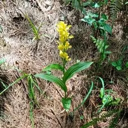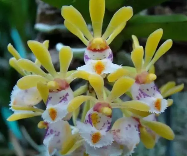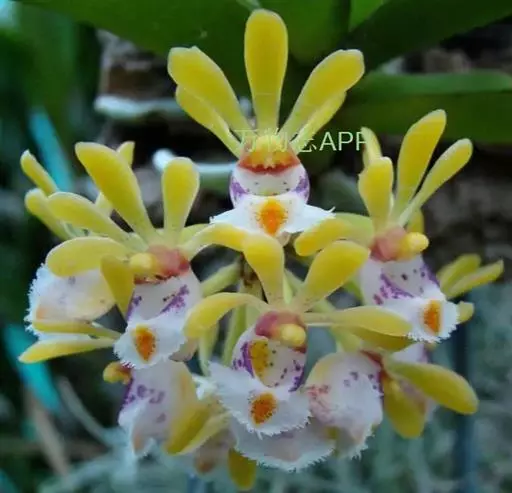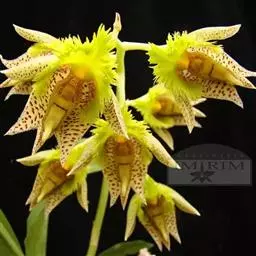 花序近伞形,1-4个,出自茎的基部侧旁,常具5-8朵花;花序柄粗壮,劲直,长1-2厘米,具2枚杯状鞘;花苞片宽卵形,长约3毫米,先端钝;花梗和子房长1-1.5厘米;花芳香,萼片和花瓣黄色带紫红色斑点;萼片几等大,近椭圆形,长6-12毫米,宽3.5-6毫米,先端钝,基部收狭。
