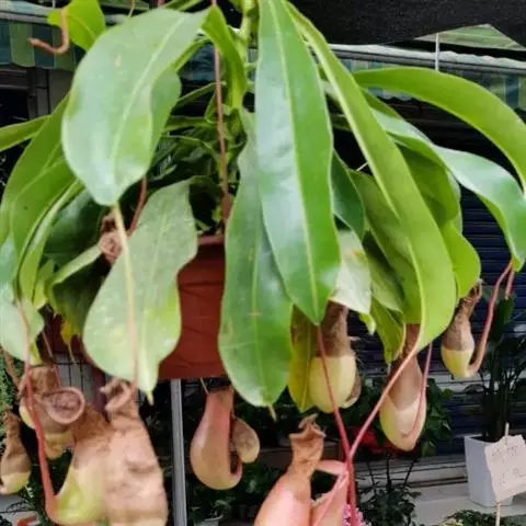 奶油葫芦猪笼草 葫芦猪笼草为原产于印度的N.Khasiana与N.gracilis杂交后代,1963年由杜米尼氏育成发表,是最耐低温的一种,栽培较普遍。捕虫囊绿色,下部膨大,状如葫芦,因而得名。