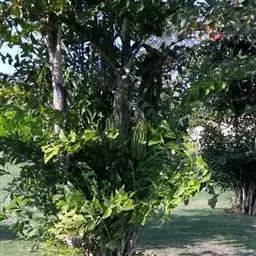种子开始萌芽后,当其幼根长约1厘米时,播入规格为8厘米×12厘米的营养袋中(移栽基质采用壤土∶有机肥∶河沙=3∶1∶1的比例配置,播种前1天用3‰的高锰酸钾溶液对基质进行消毒),移植于营养袋后覆盖土,盖土厚度为1厘米为宜,浇足定根水,搭建遮荫棚(棚高1.6米左右),搭盖透光度为75%的遮荫网,以预防阳光对幼苗的灼伤。当长至4-5片叶时,移植于40厘米×45厘米的营养袋中(最好是选择黑色营养袋),以间隔80厘米的株行距成正三角形重新排列。移苗时间应掌握在下午17:00点以后,移植后及时浇足定根水,移植一个月后可拆除遮阴棚。育苗过程中,应做好水肥管理:视天气情况浇水,视苗长势施肥。幼苗期每周施尿素(或等当量的人粪尿)一次,以每株0.1克的量兑水喷施,每次施肥后结合浇水清洗叶面,避免肥料灼伤嫩叶。苗中期视苗长势于每株根圈处施NPK复合肥10-15克,干旱季节追施农家肥,出圃前追施适量草木灰,促进苗木健壮生长,提高定植成活率。
