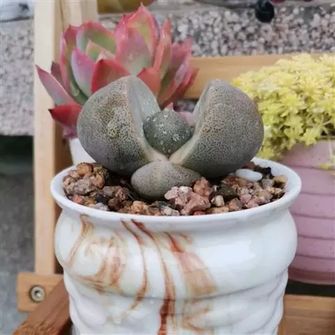 荒玉为番杏科生石花属,原产南非。株体呈白粉色,表面布满凹凸纹路,凹陷处为红褐色,每年秋季开黄花。