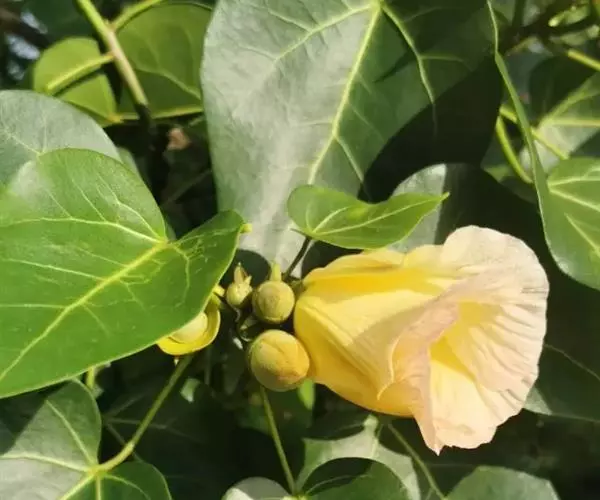 桐棉(学名:Thespesia populnea)又名恒春黄槿、杨叶肖槿,锦葵科桐棉属常绿乔木,高约6米;小枝具褐色盾形细鳞秕。叶卵状心形,长7-18厘米,宽4.5-11厘米,先端长尾状,基部心形,全缘,上面无毛,下面被稀疏鳞秕;叶柄长4-10厘米,具鳞秕;托叶线状披针形,长约7毫米。花单生于叶腋间;花梗长2.5-6厘米,密被鳞秕;小苞片3-4,线状披针形,被鳞秕,长8-10毫米,常早落;花期近全年。产台湾、广东(包括海南岛)。常生于海边和海岸向阳处。