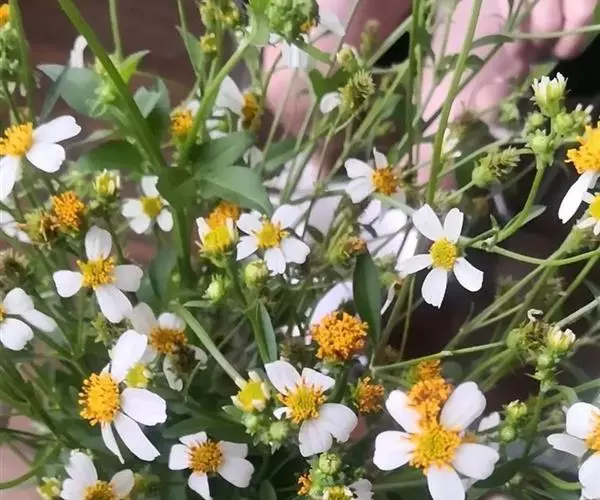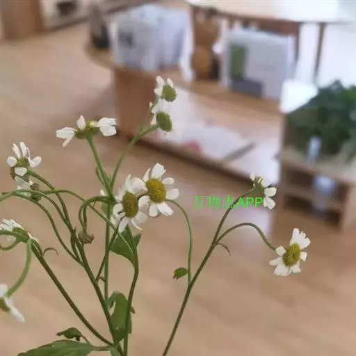 花:头状花序异型,直径1-1.5厘米,在茎枝顶端排成伞房状,花序梗长3-6厘米;总苞片2层,苍绿色,顶端钝,边缘白色宽膜质,全缘;花托长圆锥状,中空。舌状花1列,舌片白色,反折,长约6毫米,宽2.5-3毫米;管状花多数,花冠黄色,长约1.5毫米,中部以上扩大,冠檐5裂。