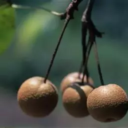 果实近球形,直径5-10毫米,2-3室,褐色,有淡色斑点,萼片脱落,基部具带绒毛果梗。花期4月,果期8-9月。