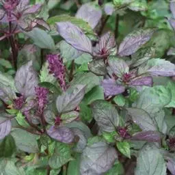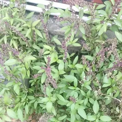 唇形科罗勒属,一年生草本,紫罗勒是罗勒的栽培变种,株高20~40cm,茎钝方形,全株暗紫红色。叶对生,卵形或长椭圆形,叶面微皱,叶缘有不规则锯齿状浅裂。花期在夏季,轮伞花序6,花排列成假总状花序,小花白色。