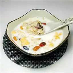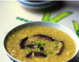 暖胃益气牛肉羹 材料:糯米180克,7杯(约1.4千克)水,50克牛肉,10g香菇,葱花、酱油、蒜泥、黑胡椒、芝麻油、盐。